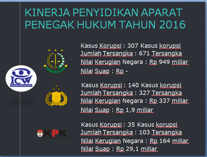 Data ICW menunjukkan kejaksaan menangani 307 kasus korupsi dengan jumlah tersangka sebanyak 671 orang dan kerugian negara mencapai Rp949 miliar pada 2016.