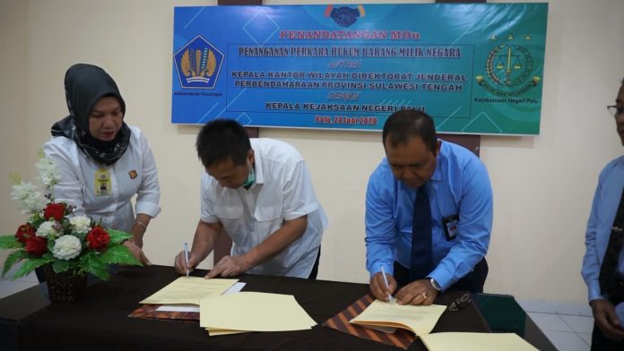 Penandatanganan MOu penanganan perkara hukum barang antara Kepala Kantor Wilayah Direktorat Jenderal Perbendaharaan Provinsi Sulawesi Tengah dengan Kepala Kejaksaan Negeri Palu dilaksanakan pada Tanggal 24 Juni 2020 bertempat di ruang Aula Kejaksaan Negeri Palu.