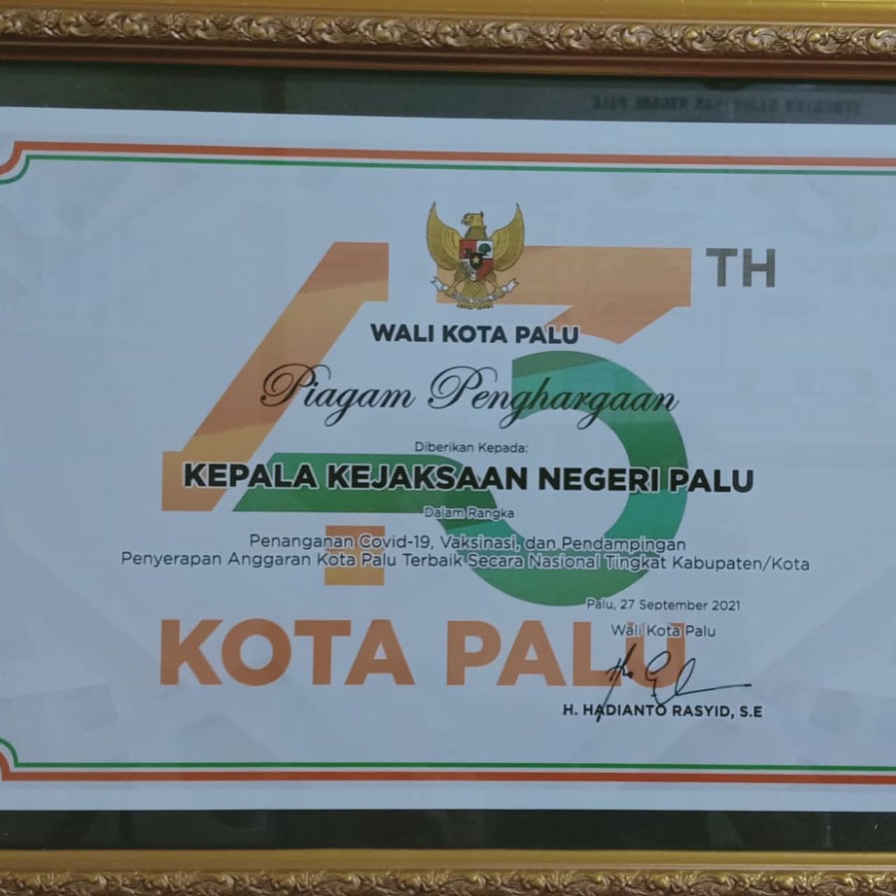 Dalam Rangka HUT Ke-43 Kota Palu, Wali kota Palu, Bapak Hadianto Rasyid, menyerahkan Piagam Penghargaan kepada Kejaksaan Negeri Palu dalam rangka Penanganan Covid-19, Vaksinasi, dan Pendampingan Penyerapan Anggaran Kota Palu Terbaik secara Nasional Tingkat Kabupaten/Kota.