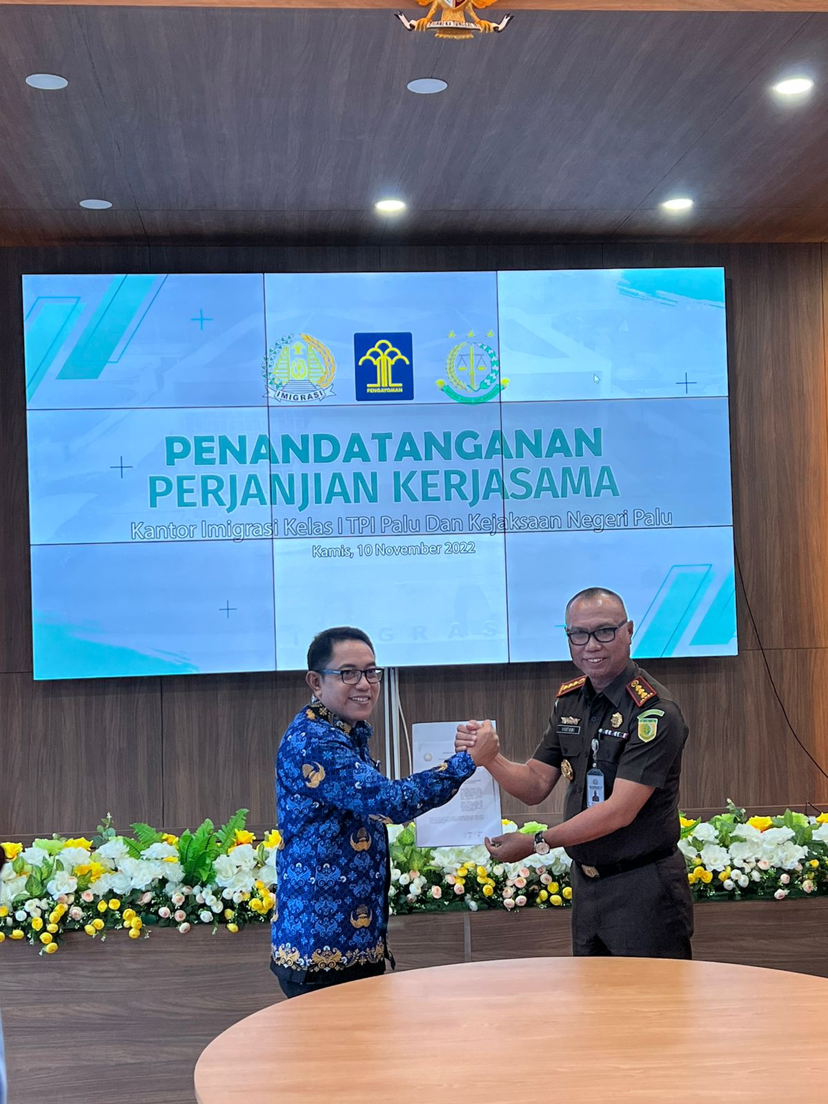 Palu – telah dilaksanakan penandatanganan Kesepakatan Bersama antara Kantor Imigrasi Kelas 1 TPI Palu dengan Kejaksaan Negeri Palu tentang bantuan hukum, pertimbangan hukum dan tindakan hukum lainnya di bidang perdata dan tata usaha negara, pada hari kamis, 10 November 2022. Penandatanganan ini dilakukan oleh Kepala Kantor Imigrasi Kelas 1 TPI Palu bapak Dewanto Wisnu Raharjo, S.H. dan Kepala Kejaksaan Negeri Palu bapak Hartawi, S.H.