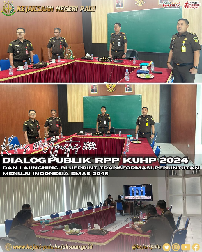 Kepala Kejaksaan Negeri Palu didampingi para Kepala Seksi mengikuti kegiatan zoom meeting “Dialog Publik RPP KUHP 2024 dan Launching Blue Print Transformasi Penuntutan Menuju Indonesia Emas 2045”.