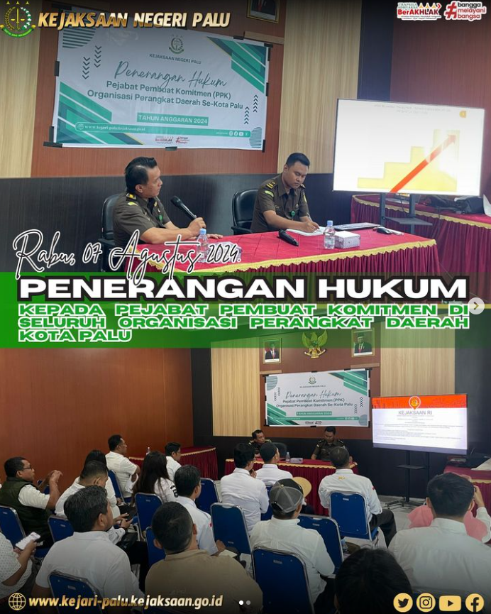 Bidang Intelijen Kejaksaan Negeri Palu melaksanakan kegiatan Penerangan Hukum kepada Pejabat Pembuat Komitmen (PPK) pada Organisasi Perangkat Daerah Se-Kota Palu. Kegiatan penerangan hukum yang dilaksanakan oleh Kejaksaan bertujuan untuk memberikan pemahaman mendalam kepada pejabat-pejabat pembuat komitmen tentang peran penting Kejaksaan dalam pencegahan korupsi. Kegiatan ini dilaksanakan untuk memastikan bahwa para PPK memiliki pengetahuan yang memadai mengenai regulasi hukum dan tata kelola yang baik guna mencegah praktik korupsi di lingkungan kerja masing-masing.